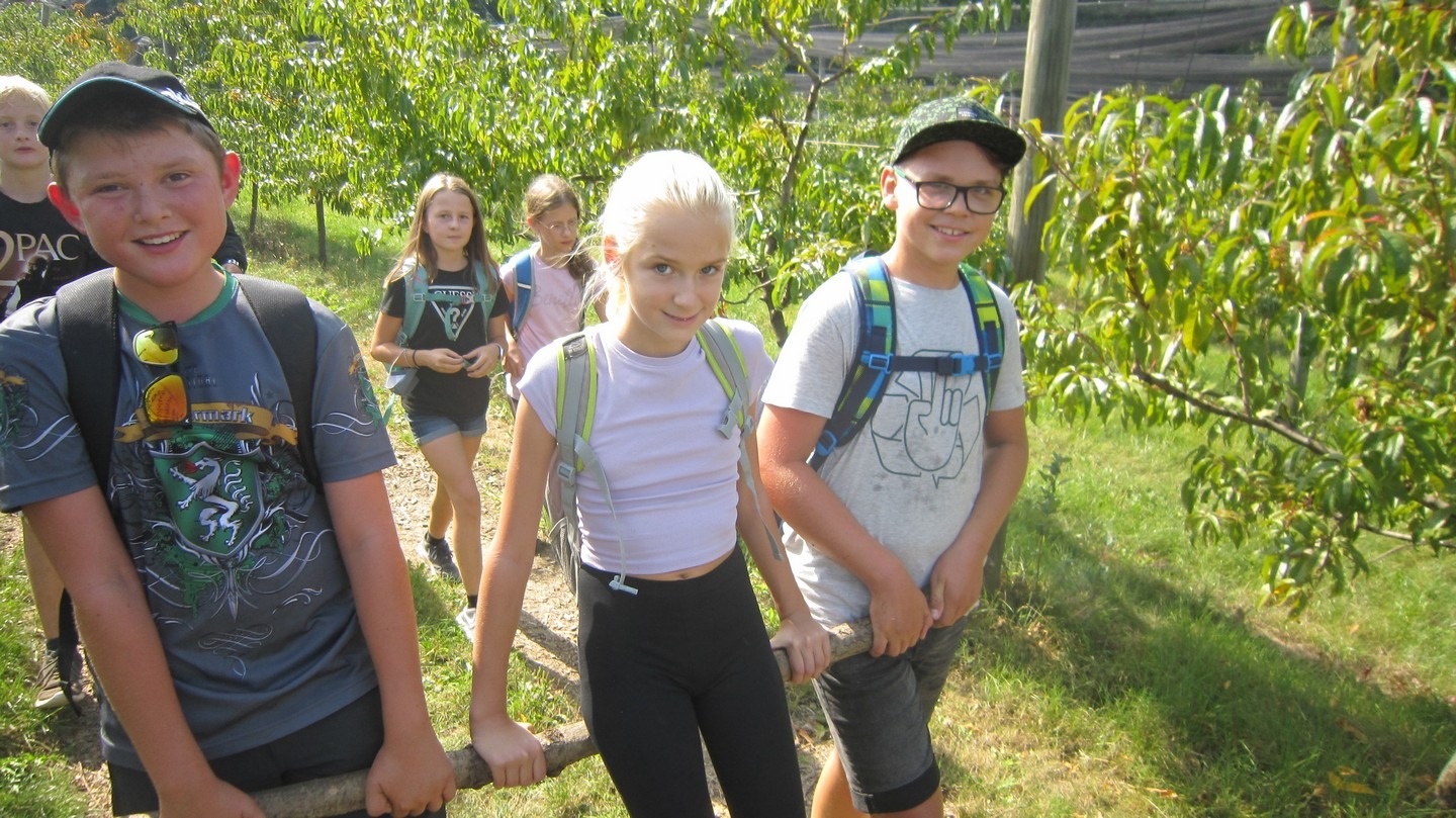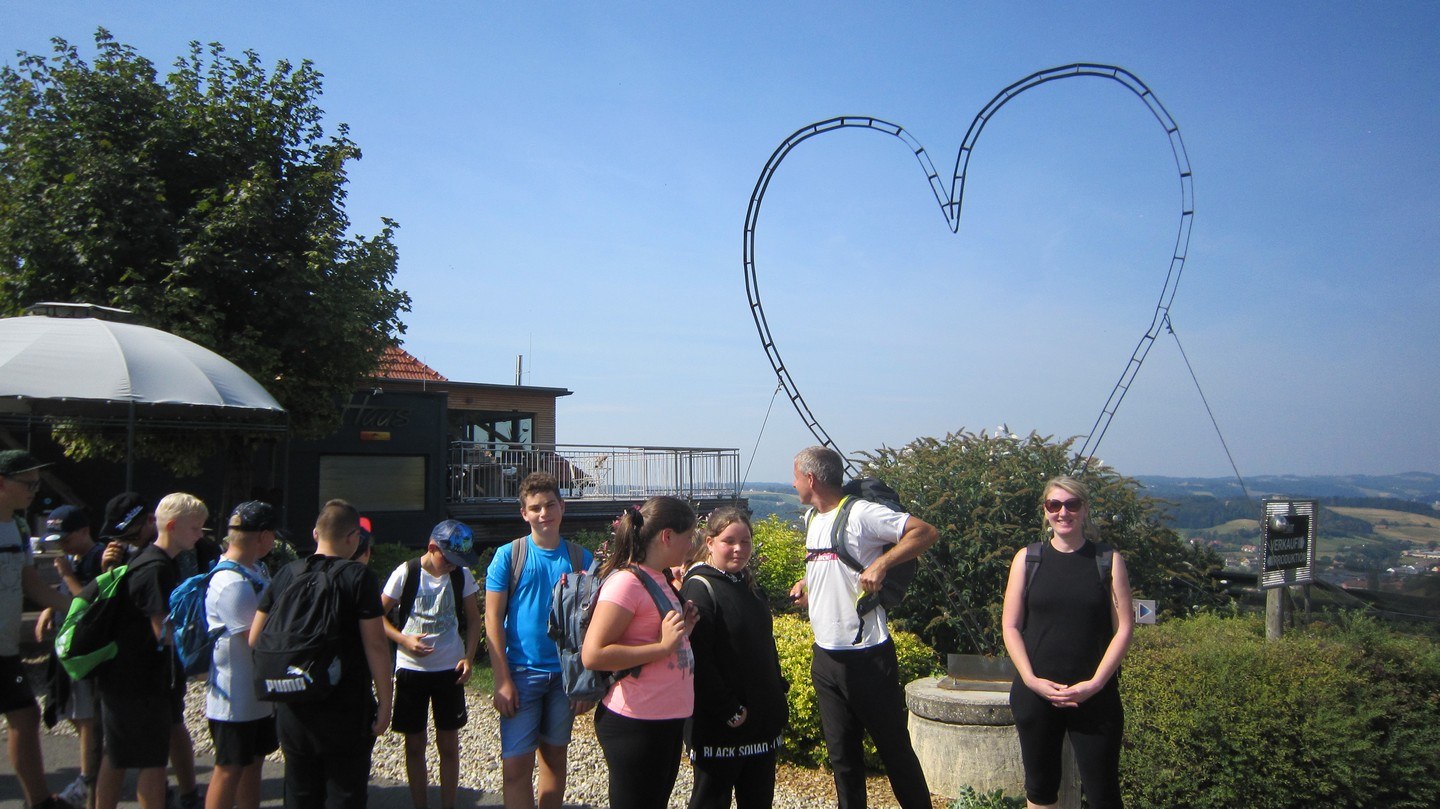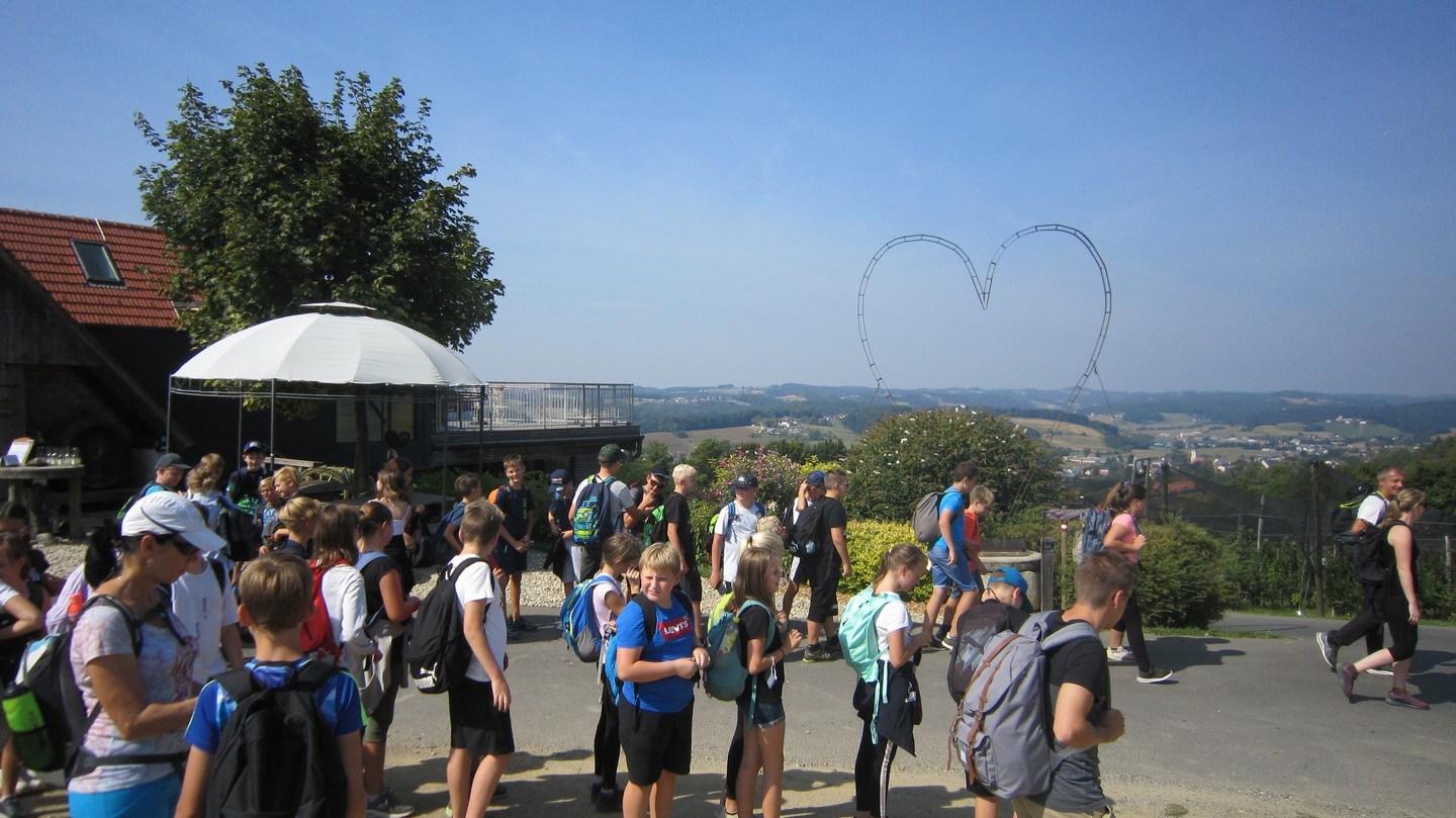 Das Kaskögerl ist einer der 40 erloschenen Vulkane im Steirischen Vulkanland. Diesen Kegel erwanderten die Schülerinnen und Schüler der 2. Klassen der Mittelschule schon am Mittwoch in der ersten Schulwoche. Der Kaskögerlweg führte die 2a und die 2b bei strahlendem Sonnenschein vom Gasthaus Binderhansl in Gnas bis zur „Wiedehopf-Arena“ in Poppendorf. Immer wieder diente uns dabei der Wiedehopf, ein außergewöhnlicher Vogel, auf den Tafeln als Wegweiser bis zum Schloss Poppendorf. Dort erkundeten alle den finsteren Schlosskeller und fanden schließlich das Schlossgespenst versteckt in einem Raum. Nach dem Erreichen des höchsten Punktes (393 m) rasteten alle noch einmal beim Obstbau Haas, wo der Hund „Semi“ abgeholt wurde. Ein Herz für Kinder hatten dabei die Lehrerinnen und Lehrer.