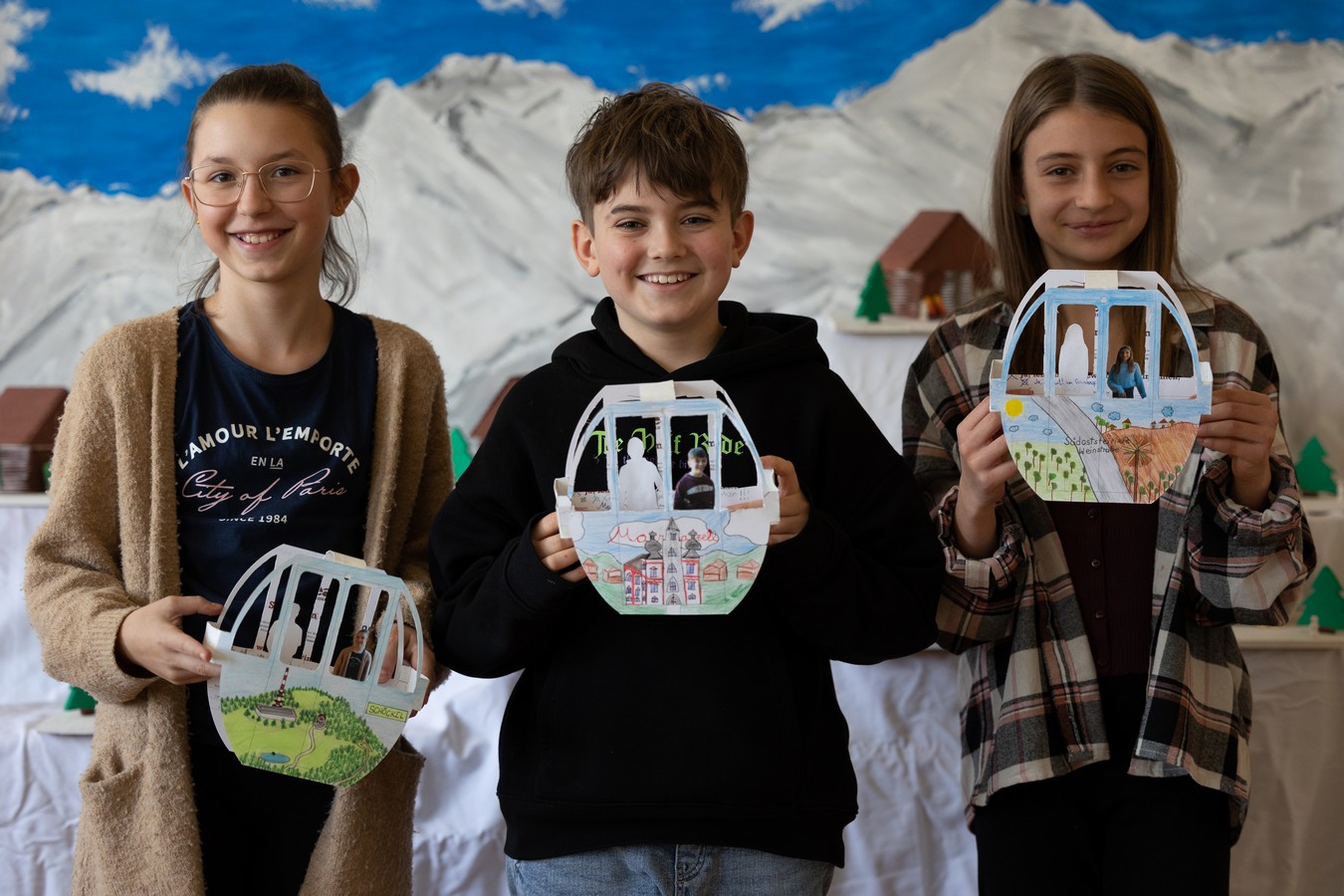 Dafür haben wir uns in den vergangenen Wochen mit großem Eifer unseren Gondeln gewidmet. In unserem Bildnerischen Erziehungs- sowie im Werkunterricht wollten wir etwas Besonderes schaffen. Wir überlegten uns, wie wir die Gondeln am besten präsentieren konnten und entschieden uns dafür, dass wir im Werkunterricht eine passende Kulisse bauen wollten. Mit Hilfe von Holzstäbchen leimten wir in Kleingruppen Hütten zusammen, bauten aus Holzkugeln Schneemänner, gestalteten Ski und sägten Bäume aus.