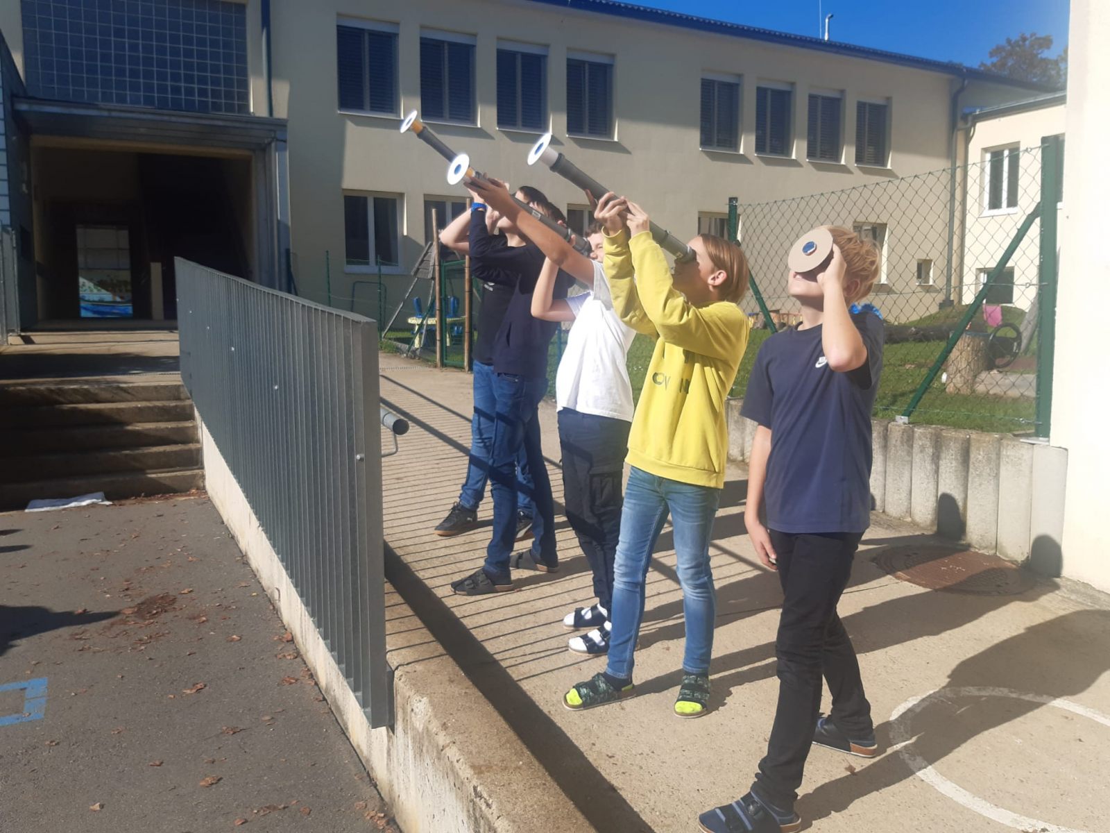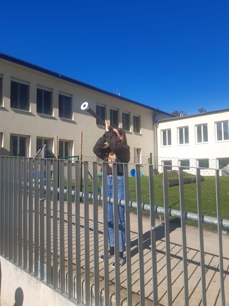 Gemeinsam –insieme- beobachteten die Schülerinnen und Schüler der VS und MS St. Stefan, wie sich der Mond langsam vor die Sonnenscheibe schob. Mit speziellen Filtern ausgestattet, wurde mit zwei Spiegelteleskopen, dem Linsenteleskop der Schule und zehn weiteren, selbstgebauten Linsenteleskopen der NAWEX-Gruppe der Kernschatten des Mondes „unter die Lupe genommen“.