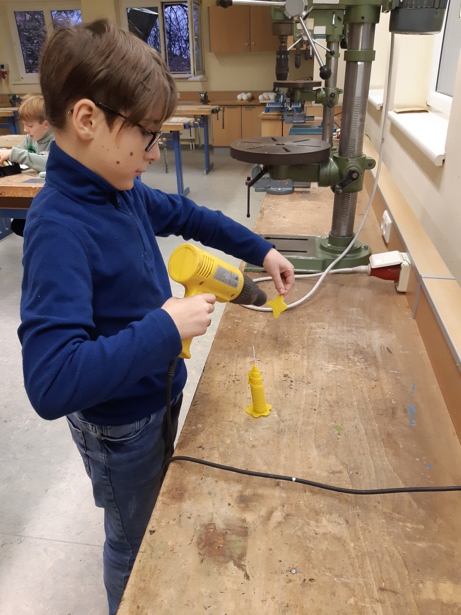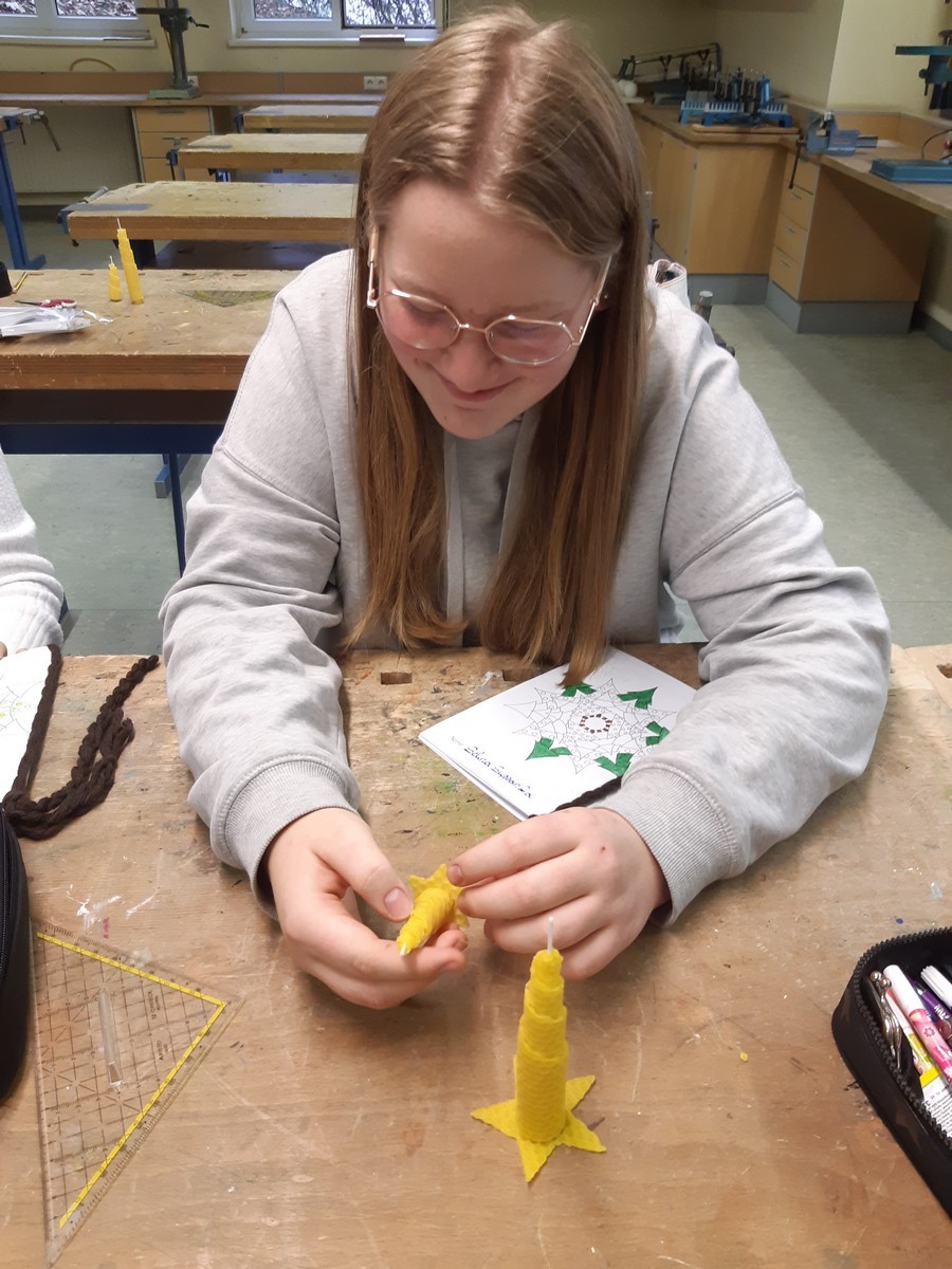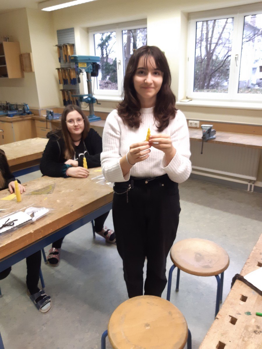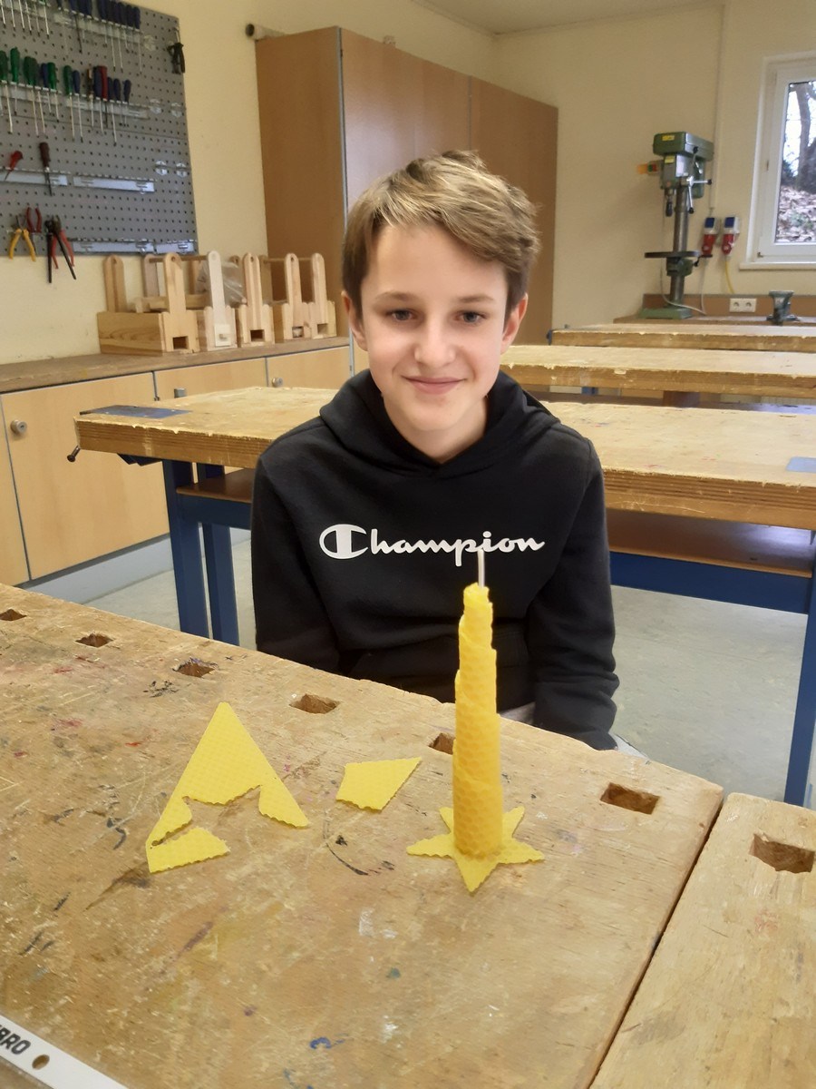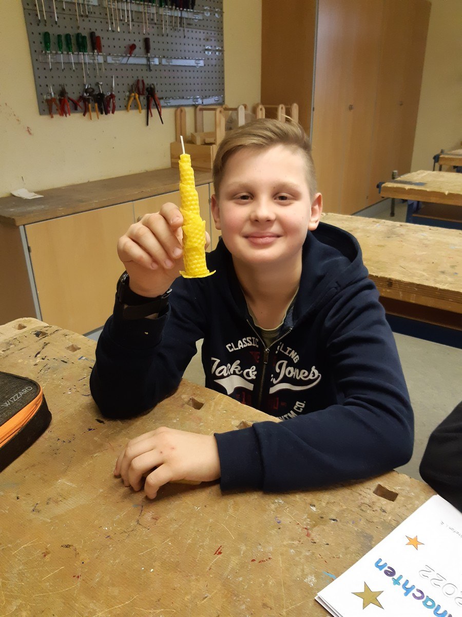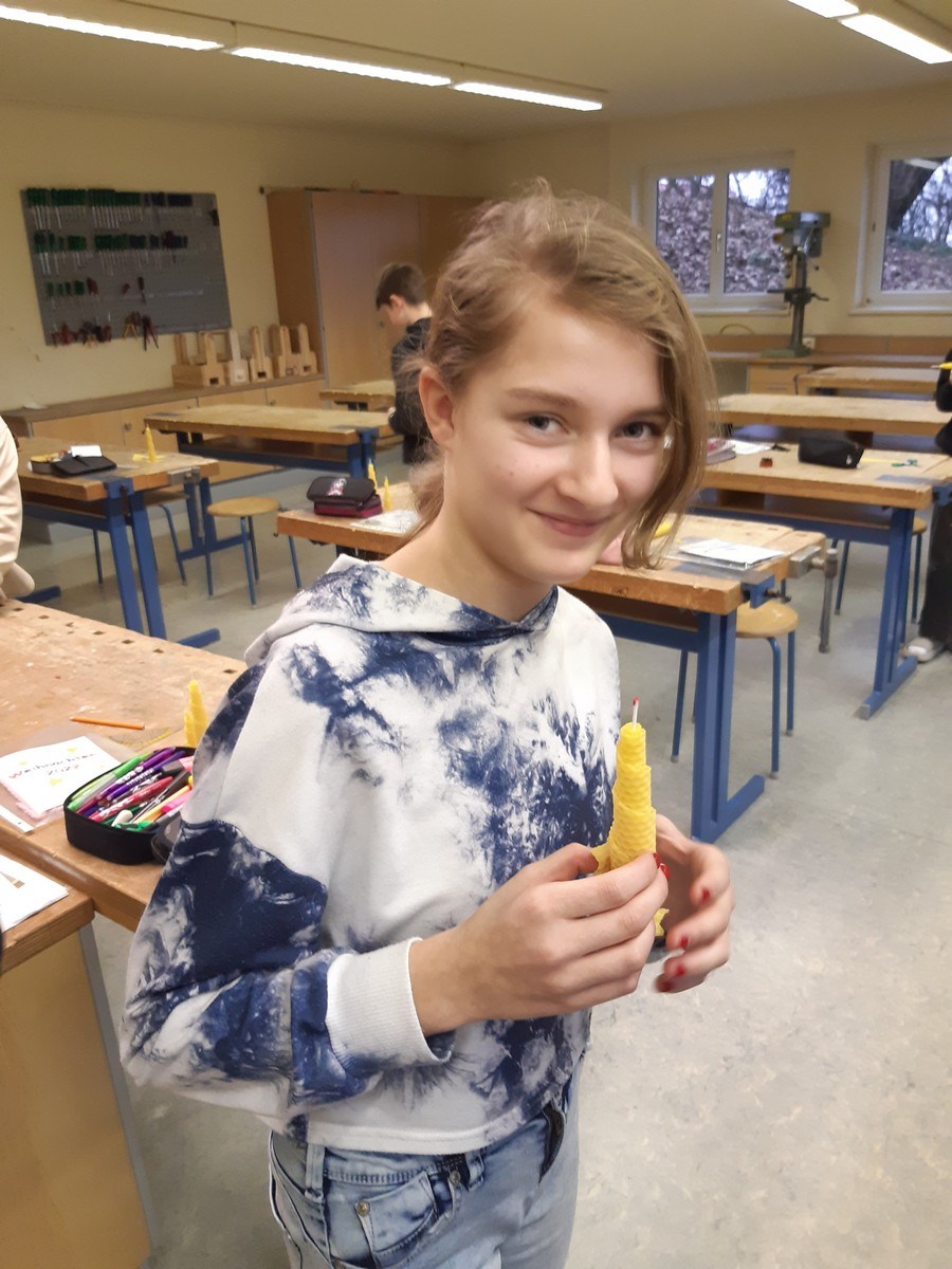 In der Frühaufsicht wurden wir, die zweiten Klassen, in vier Gruppen aufgeteilt. Bei Frau Maier sangen wir sowohl deutsche als auch englische Weihnachtslieder, dazu bastelten wir ein kleines Musikheftchen. Frau Maier begleitete uns mit wunderschöner Musik auf dem Klavier. Die Stunde verging wie im Flug. Die Autorenlesung war in der zweiten Stunde. Dort spielte uns der Autor Hannes Hörndler aus seinen Büchern einige Szenen vor – das fanden wir alle sehr lustig. Zum Abschluss gab es ein Gewinnspiel, bei dem man sein Buch „Verdammt! Ich bin ein Buch!!!“ gewinnen konnte. Frau Felgitscher machte mit uns Kerzen aus Bienenwachs. Ob eine große oder zwei kleine war uns frei überlassen. Wir tanzten und sangen zur weihnachtlichen Musik. Mit Frau König bastelten wir ein Kerzenglas mit Leim, Seidenpapier und kleinen Perlen. Wir hörten auch in dieser Stunde Weihnachtsmusik. Nun kam auch schon die letzte Stunde des Projekttages mit Frau Kaspar. Wir bastelten mit ihr einen voll süßen Faltengel. Der Kopf musste mit einer Heißklebepistole angeklebt werden, das machte keinem Probleme,dafür aber die Schnur, die man durch den Kopf bzw. durch die Holzperle fädeln musste. In dieser Stunde hörten wir – genauso wie in den anderen – Musik und sangen dazu. Uns allen hat der Projekttag sehr gefallen.