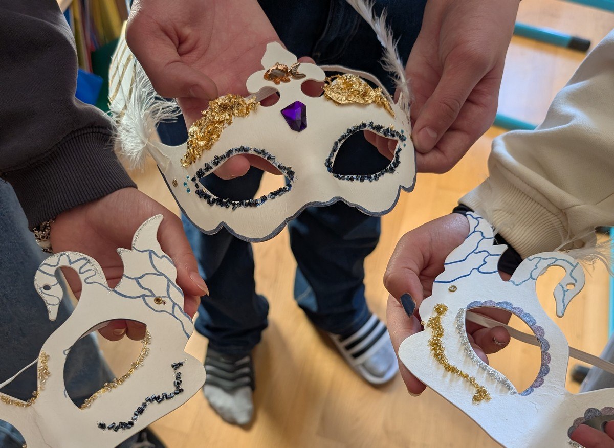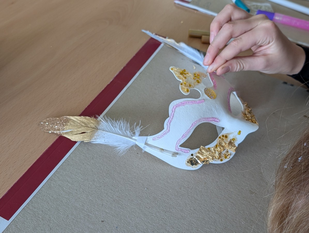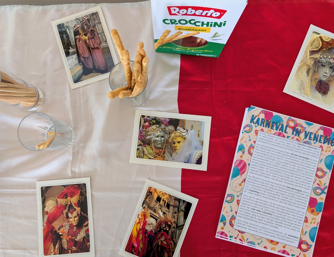 Passend dazu wurden unsere Schülerinnen und Schüler selbst kreativ: Mit viel Fantasie, Glitzer, Farben und Federn gestalteten sie ihre eigenen venezianischen Masken. Währenddessen lief italienisches Radio im Hintergrund – so konnten alle ein wenig echtes Italien-Feeling erleben. Natürlich durfte auch eine kulinarische Kleinigkeit nicht fehlen: Knusprige Grissini sorgten für die passende Stärkung zwischendurch.