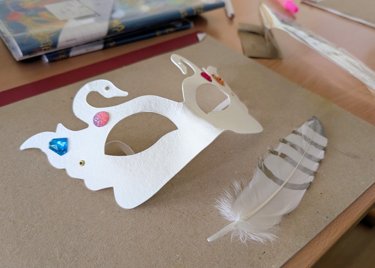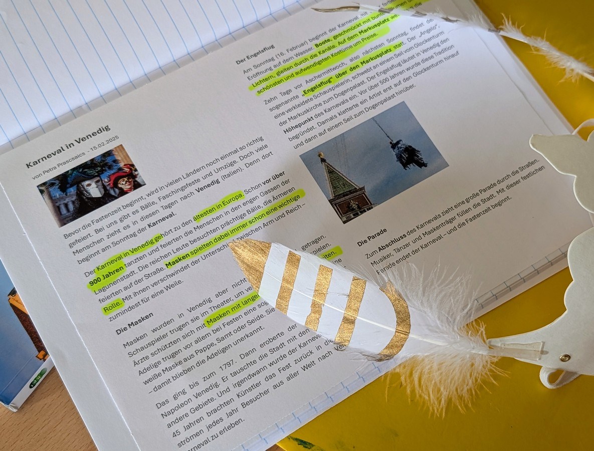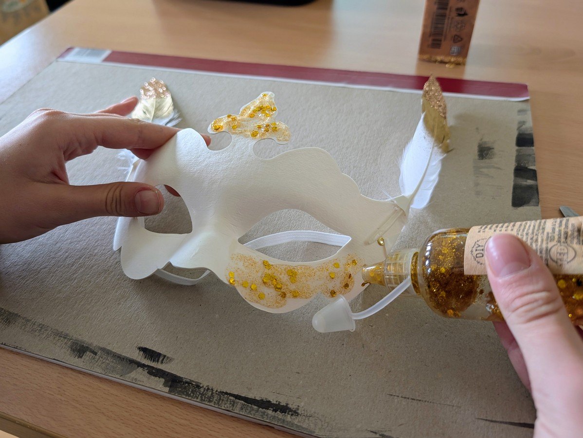 Passend dazu wurden unsere Schülerinnen und Schüler selbst kreativ: Mit viel Fantasie, Glitzer, Farben und Federn gestalteten sie ihre eigenen venezianischen Masken. Währenddessen lief italienisches Radio im Hintergrund – so konnten alle ein wenig echtes Italien-Feeling erleben. Natürlich durfte auch eine kulinarische Kleinigkeit nicht fehlen: Knusprige Grissini sorgten für die passende Stärkung zwischendurch.