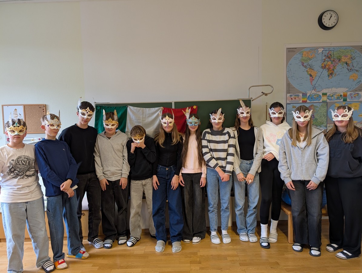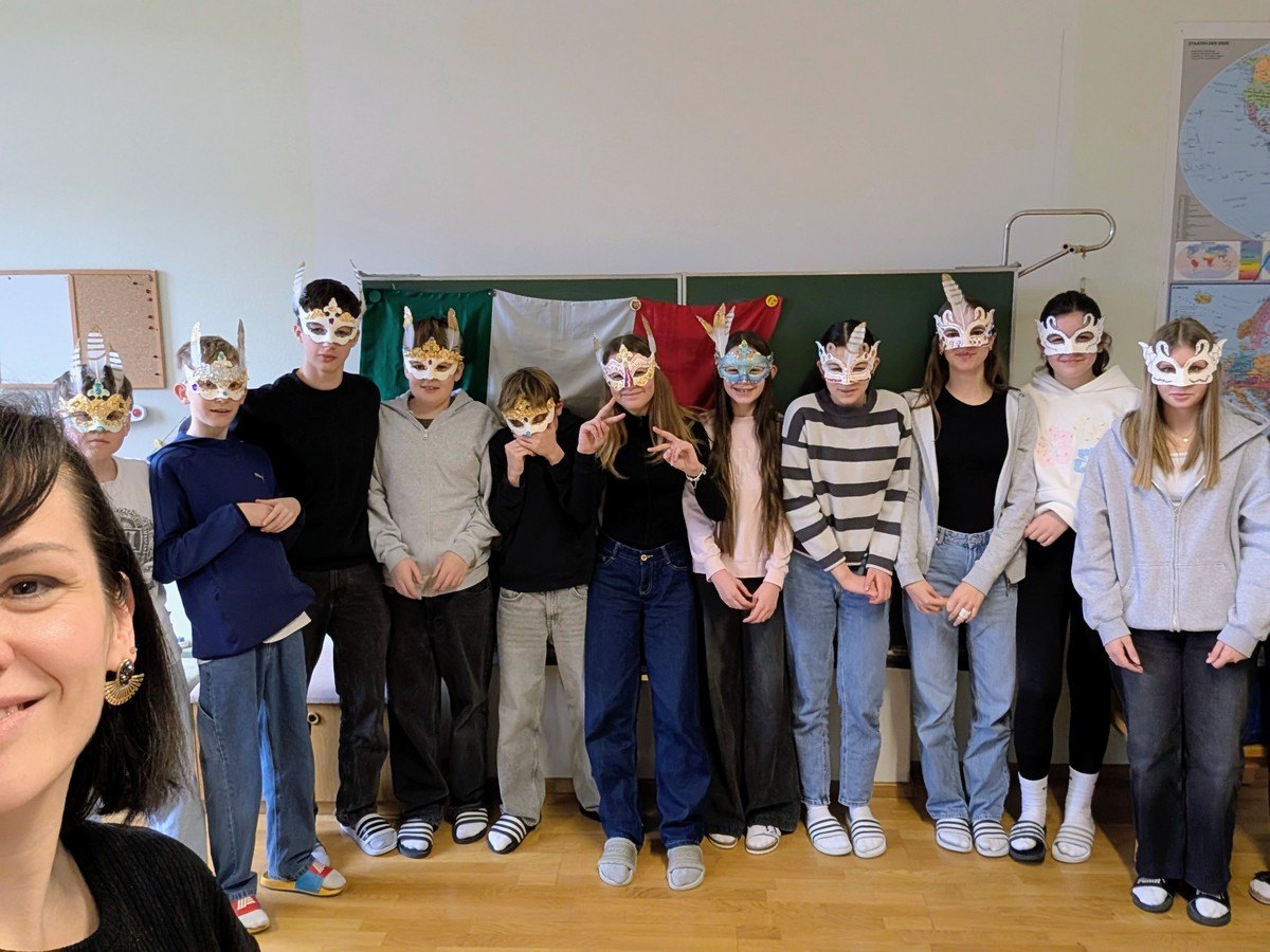 In unserer besonderen Italienischstunde wurde es bunt, kreativ und ein bisschen geheimnisvoll. Die Schülerinnen und Schüler tauchten ein in die Welt des berühmten Karnevals in Venedig und lernten dabei eine der faszinierendsten Traditionen Italiens kennen.